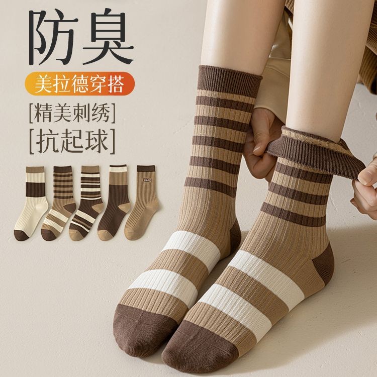 Xiling "Striped Day Miscellaneous" autumn and winter retro wood tone striped over the knee thigh socks for women