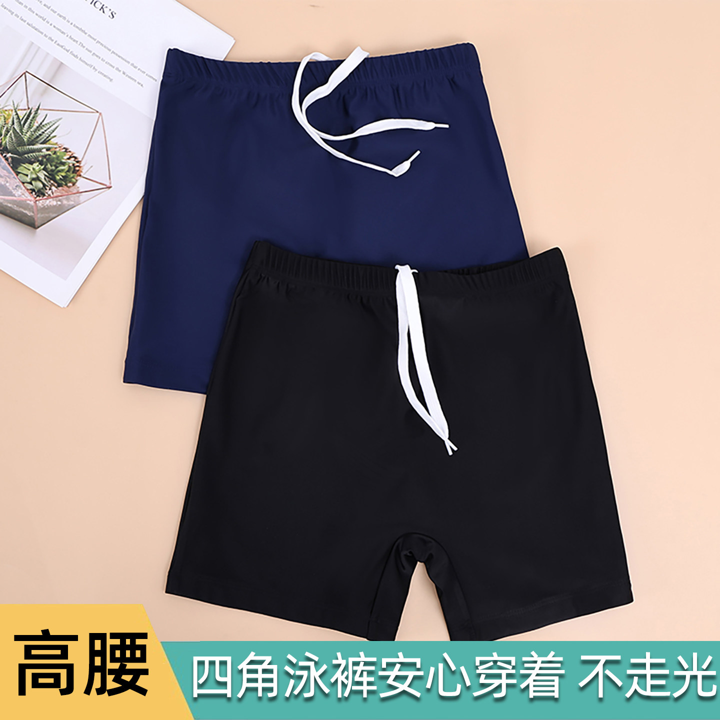 Black high-waisted swimming trunks, women's boxer anti-exposure, single bottom, with skirt bottom and four-corner swimming shorts