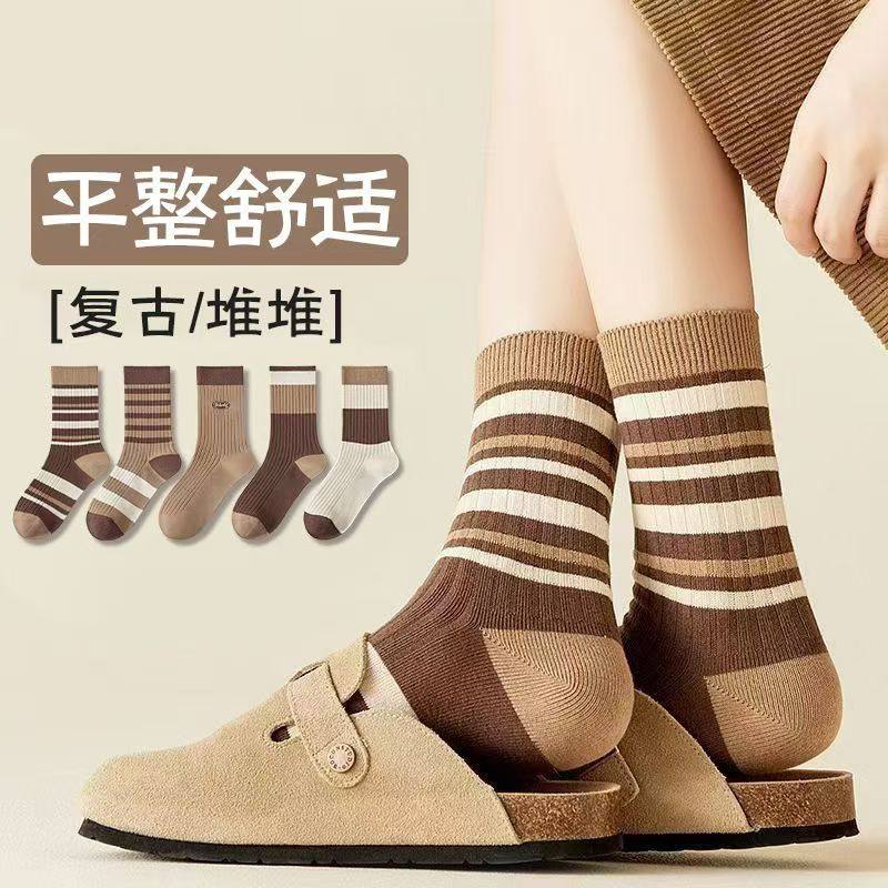 New women's socks Maillard series retro trend autumn and winter mid-tube socks striped brown women's socks stacked versatile