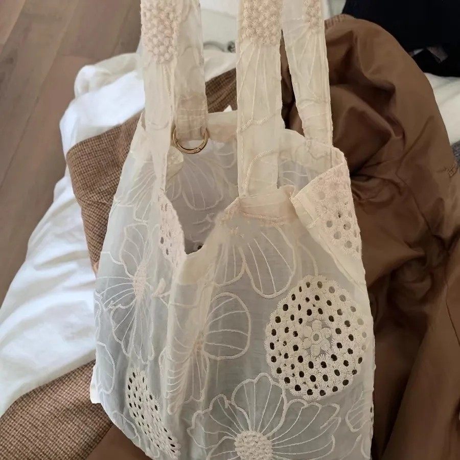 Summer French literature and art heavy industry hollow embroidery shoulder bag cloth bag gentle romantic temperament women's bag semi-transparent cloth bag