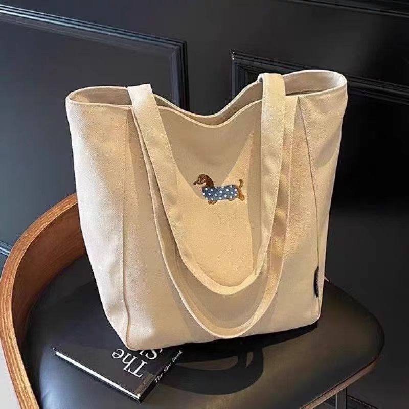 B embroidered dachshund canvas bag female large capacity student class tote bag casual versatile one shoulder commuter tote B