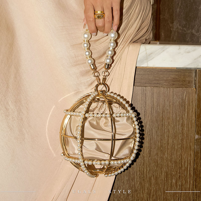 UGALS Vintage Metal Spherical Pearl Satin Birdcage Banquet Temperament Versatile Openwork Banquet Clutch Crossbody Bag