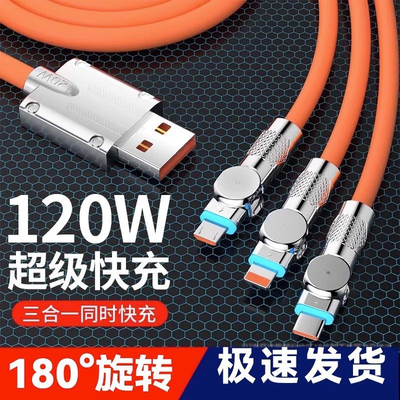 3-in-1 charging cable 180 degree zinc alloy rotation 1 tow 3 mobile phone data cable super fast charging elbow with light