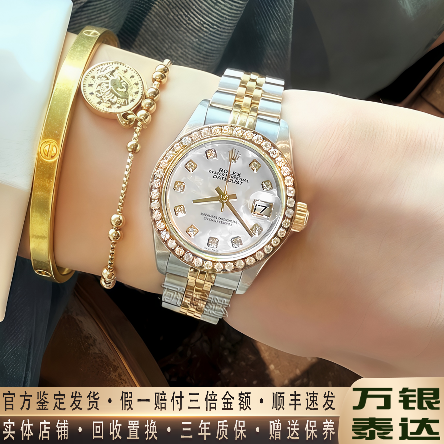 Rolex women's watch date type 18k yellow gold white mother-of-law diamond inlaid mechanical watch women's genuine 98 new 69173