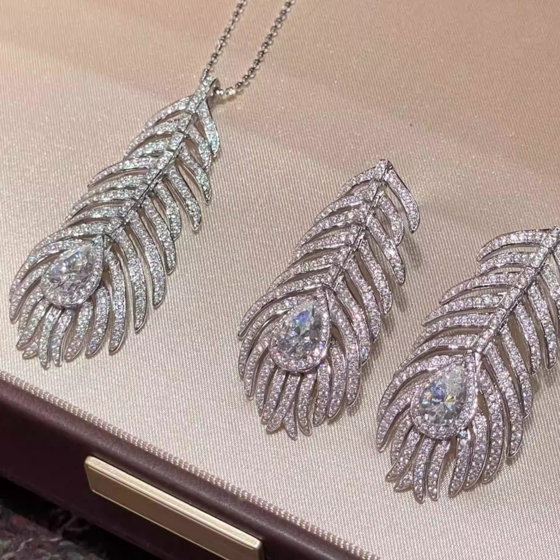 If it is not jewelry|Haute Couture full diamond-encrusted feather tassel necklace earrings set|Silver gilding