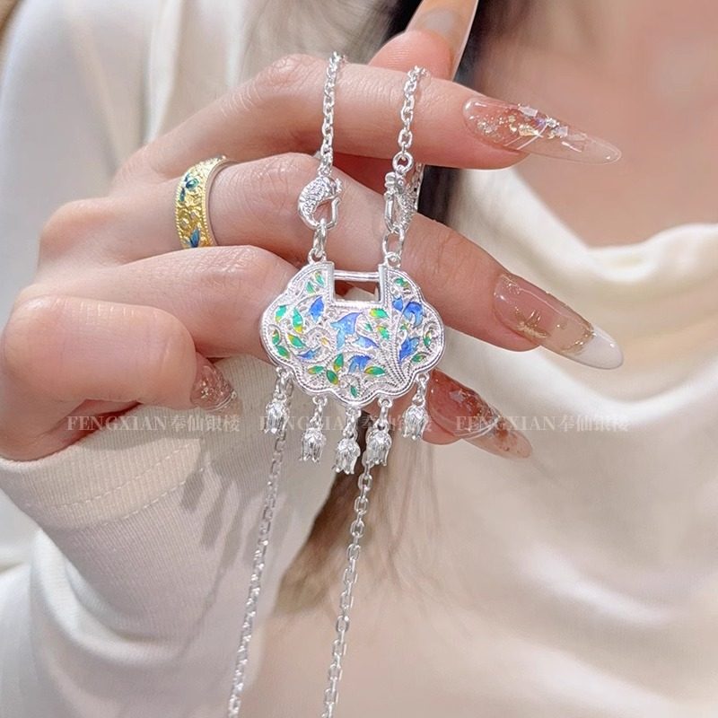 "Yingluo Lock" pure silver 999.9 sterling silver necklace lily of the valley flower tassel lock pendant collar national style new Chinese style