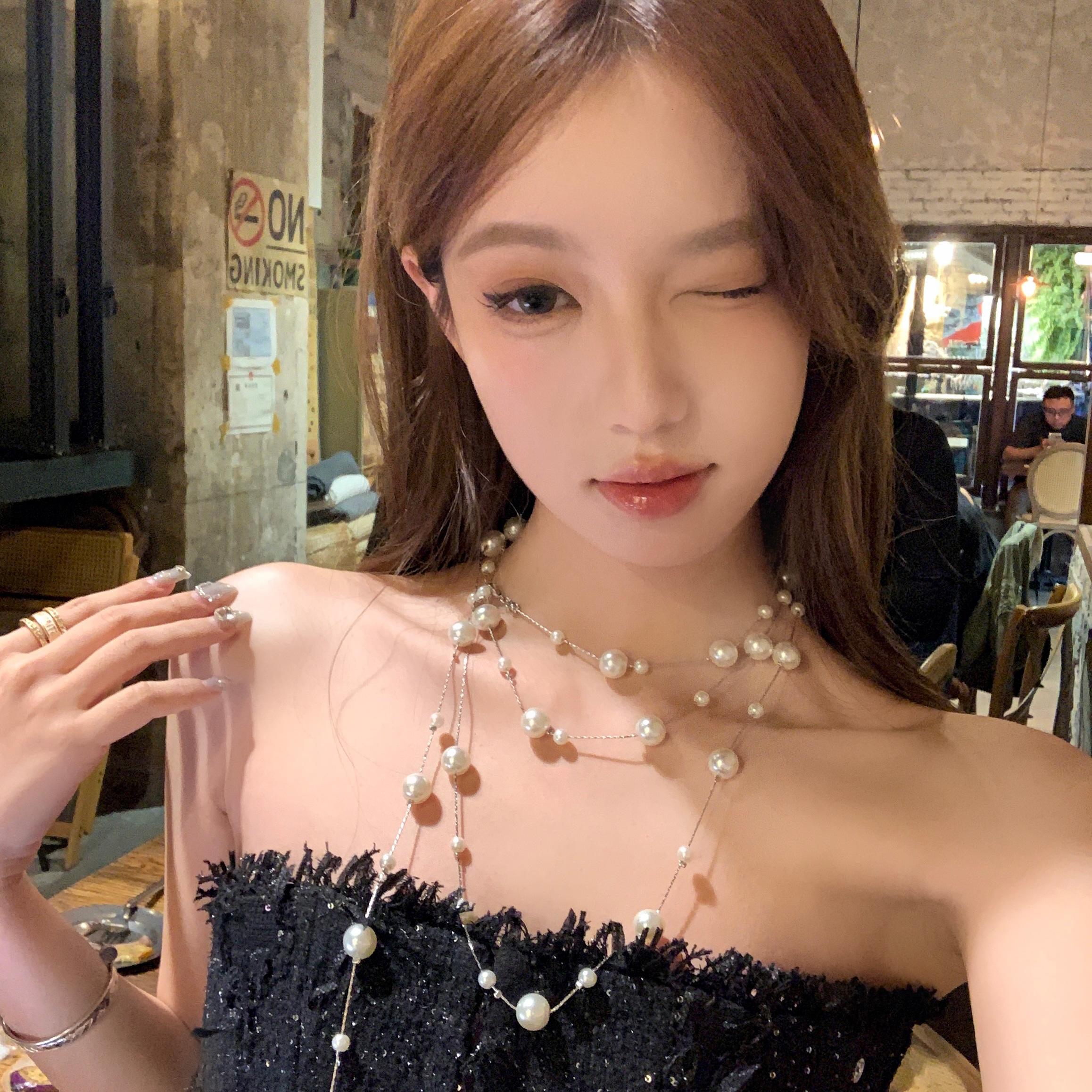 【Peach Tea】Fragrant Daughter Champagne Gold Multi-layer Baby's Breath Pearl Necklace Long Layered Necklace Accessories