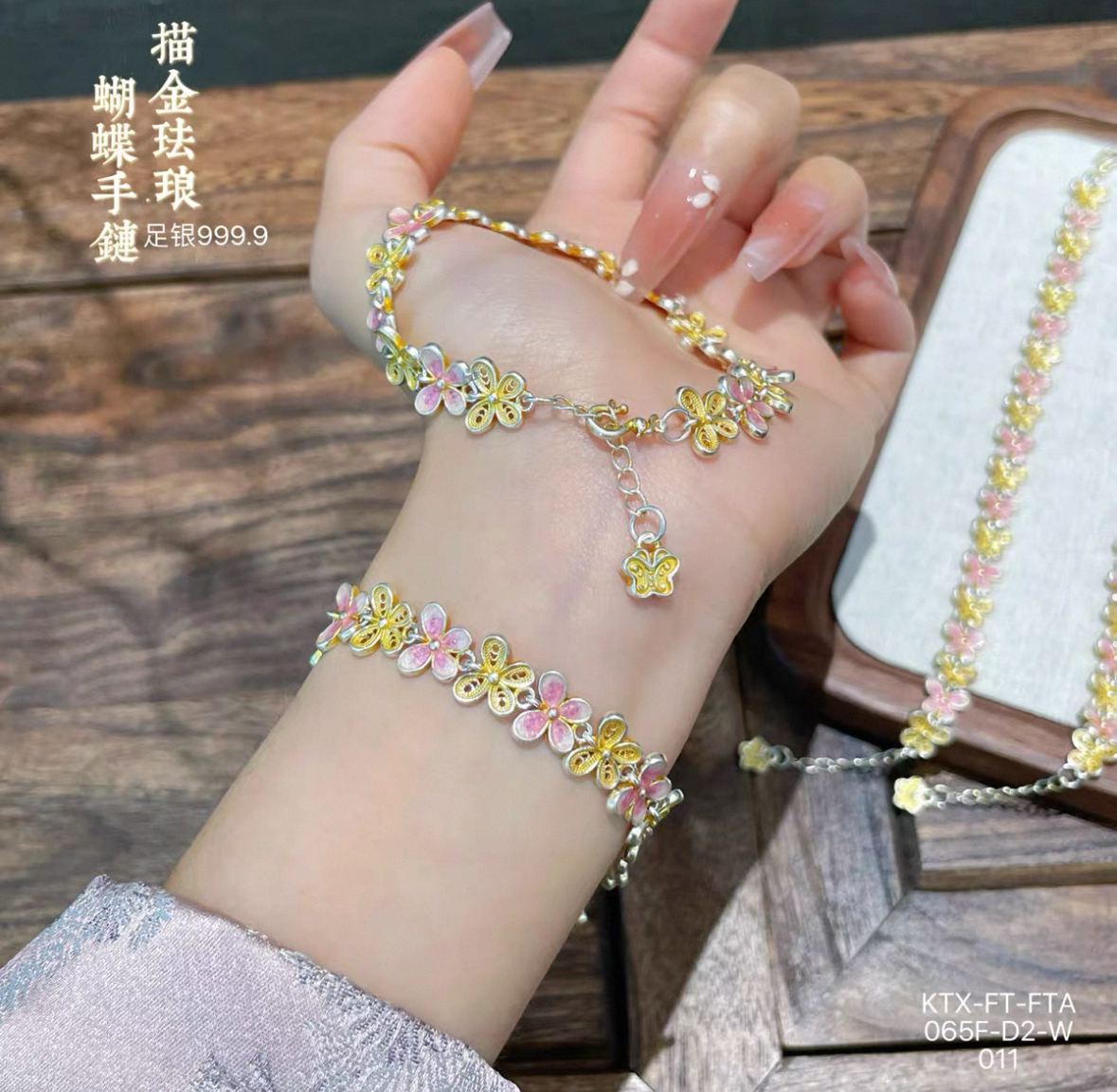 "Enamel Butterfly" star double heart bracelet pure silver 9999 sterling silver gold-painted bracelet women's new Chinese style bracelet