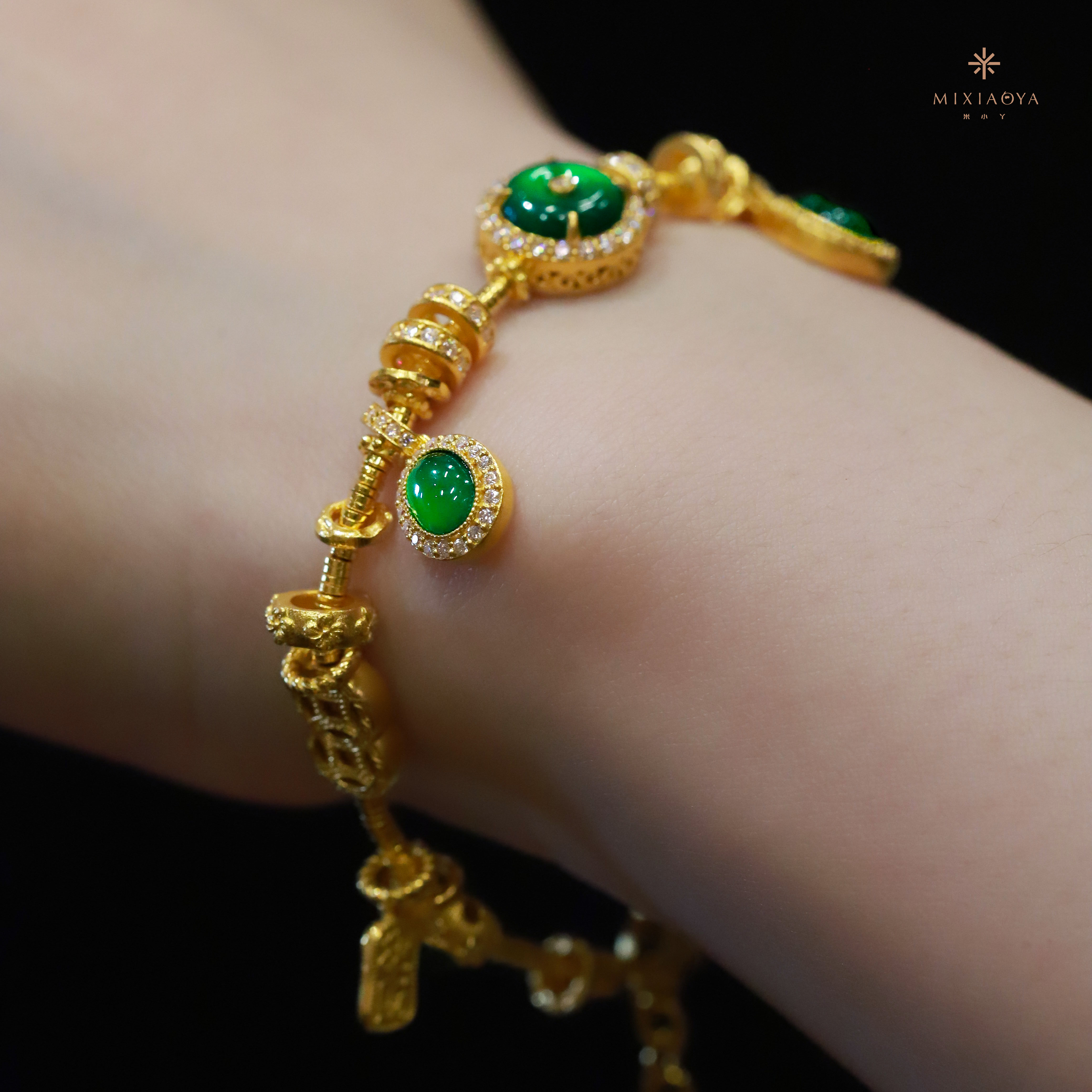 Mi Xiaoya jewelry pure gold 999 natural jade safety buckle bracelet diamond inlaid with ancient gold gourd coil
