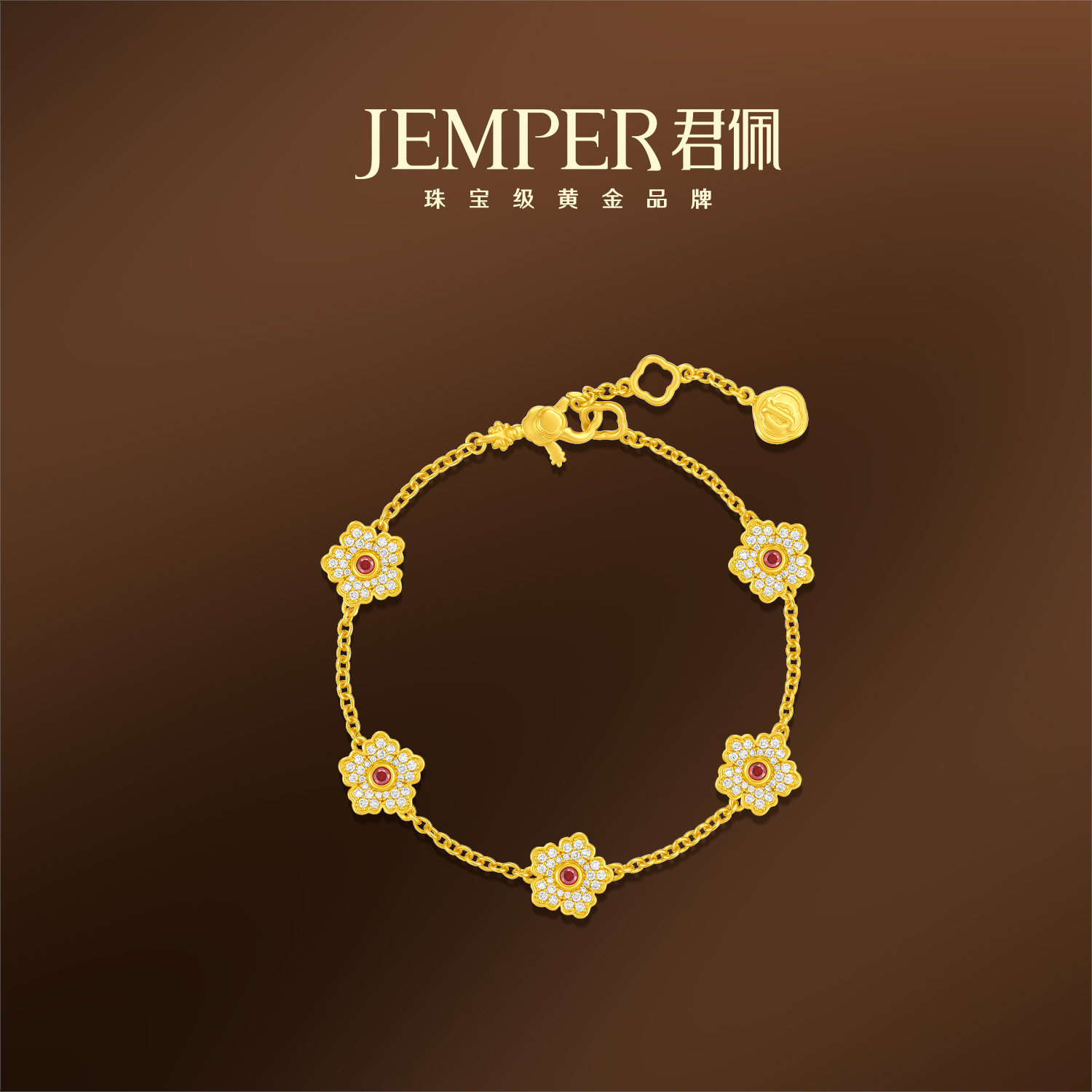 JEMPER / Jun Pei Wealth Peony Handmade Ancient Gold Five-Flower Full Diamond Ruby Pure Gold Diamond Bracelet
