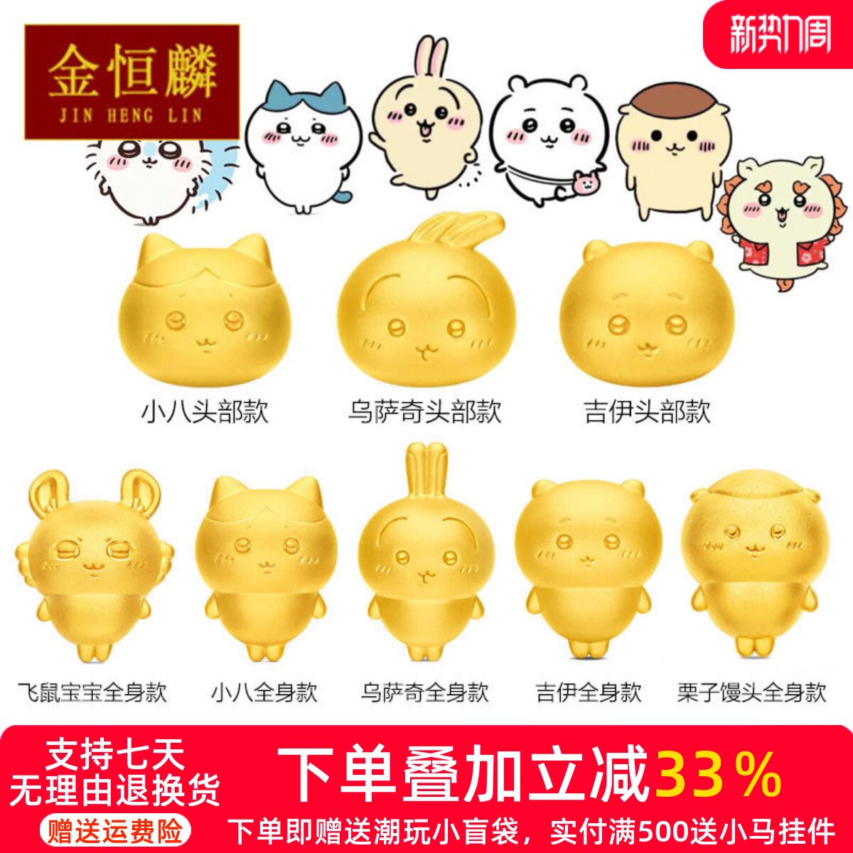 999 pure gold chiikawa usachi transfer beads gold little eight jii little flying squirrel baby 3D hard gold bracelet