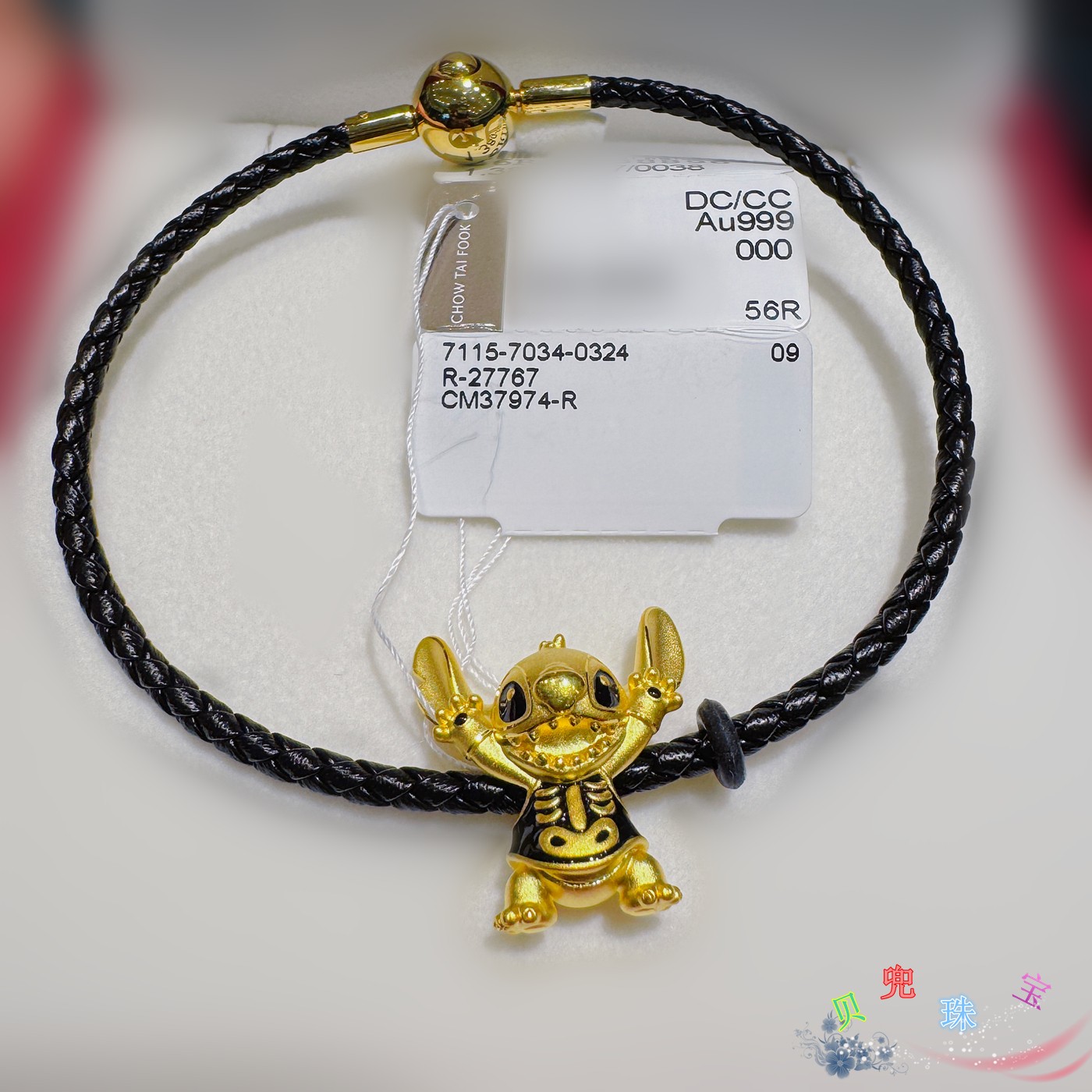 Hong Kong Chow Tai Fook counter Disney series pure gold Halloween Stitt Tsz gold transfer bead leather rope bracelet