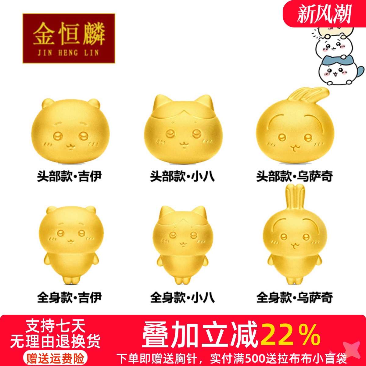 999 pure gold chiikawa usachi transfer beads gold little eight jii little flying squirrel baby 3D hard gold bracelet