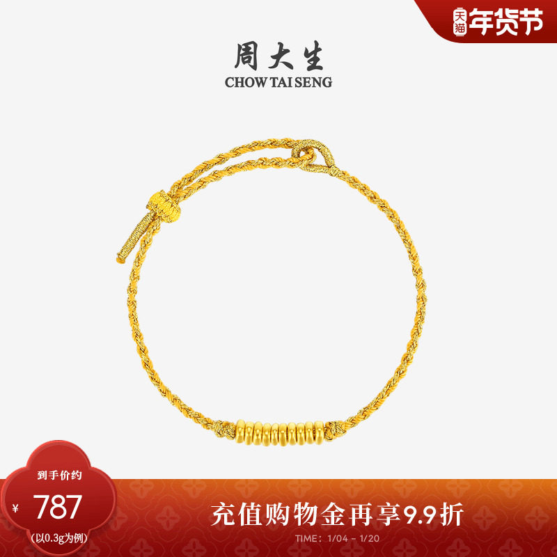 Chow Tai Sheng's gold good luck coil bracelet full gold hard gold beaded bracelet rope coil wrapped gold New Year's gift for girlfriend