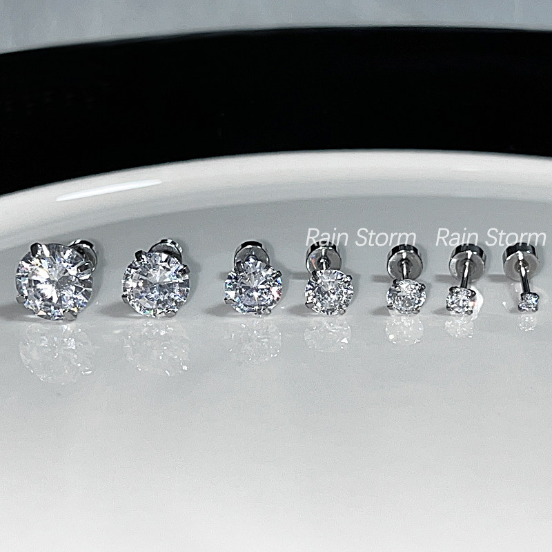 Rain Storm Super Flash White Round Diamond Ear Stud Titanium Steel Flat Bottom Screw Cochlear Nail Sleeping Rabbit Stud Picking Earrings