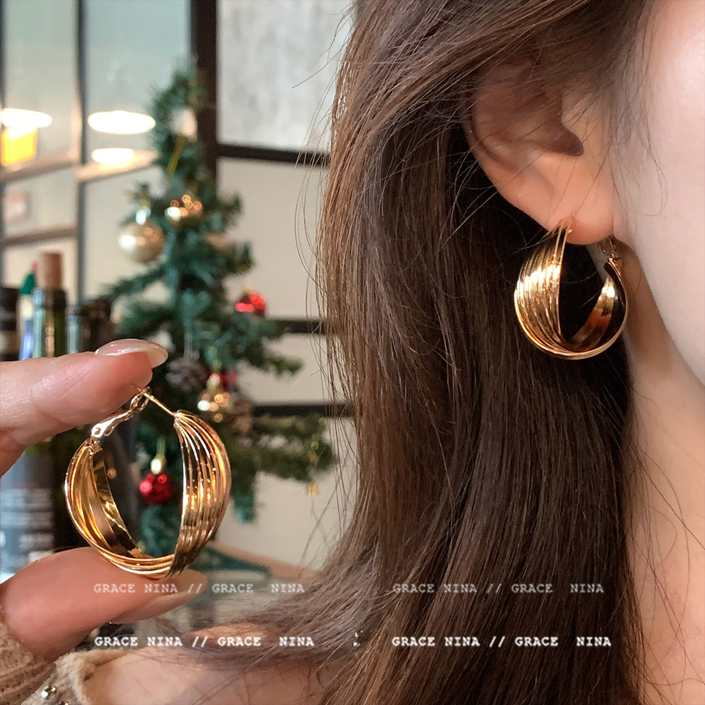 European and American metal gold silver diamond check large hoop earrings women's light luxury high-end temperament earrings earrings earrings earrings