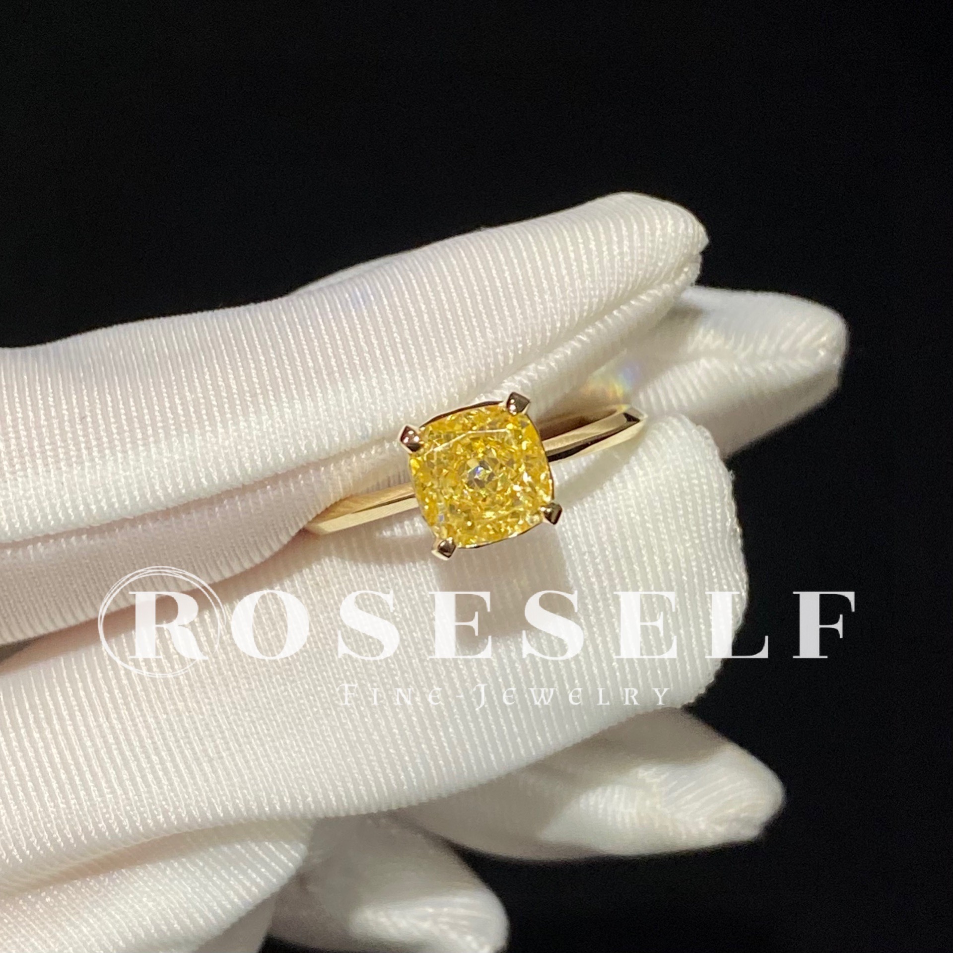 【ROSE】1 carat cushion cushion simulated yellow diamond ring artificial diamond 18K yellow gold sugar cube four-prong diamond ring