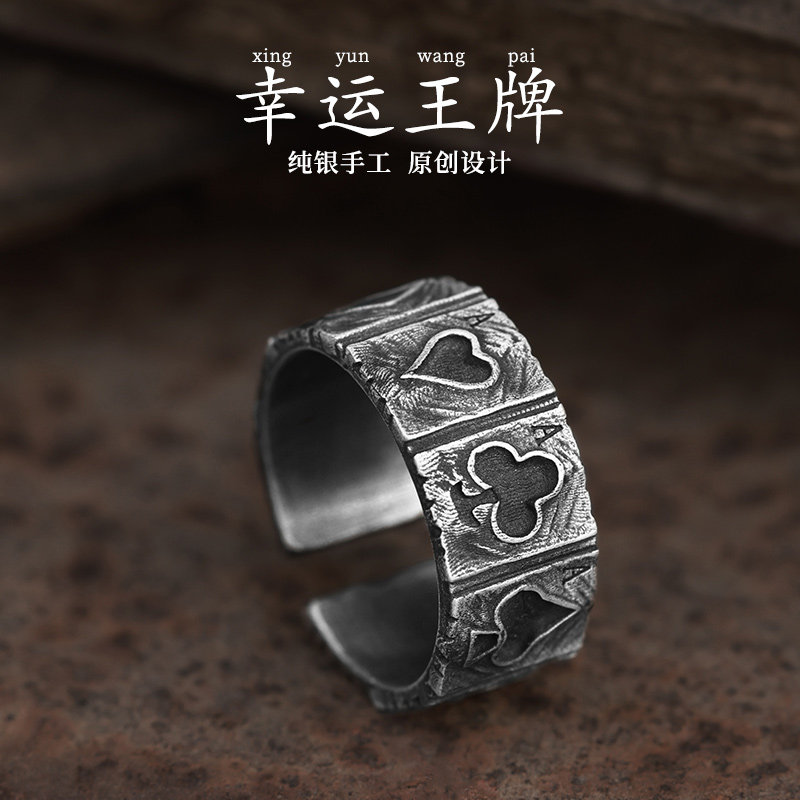 Silver original "Lucky Ace" boys' playing card ring 999 sterling silver good luck retro male niche