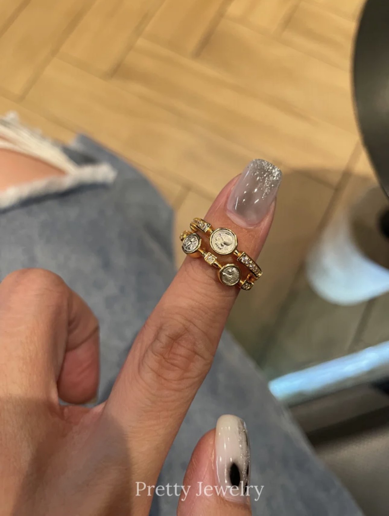 Lady's [Twin Flower Winding] S925 silver plated real gold|water drop petal yellow diamond five-petal flower three-layer ring