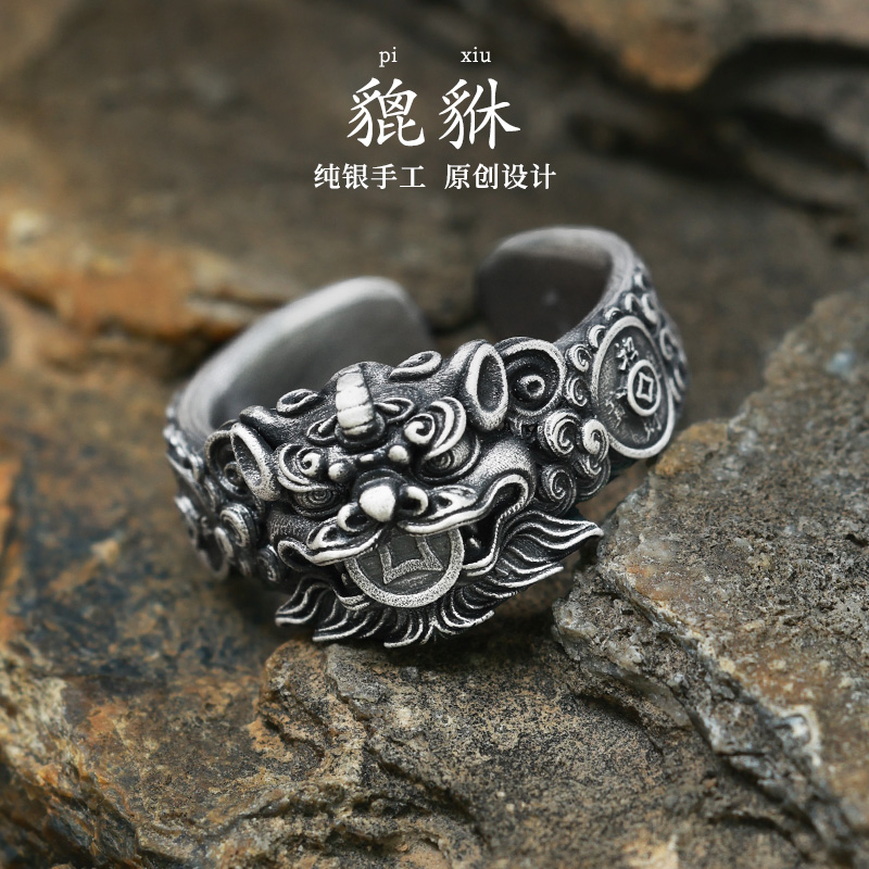 Silver art original fortune "Pixiu" ring 999 sterling silver men's solid national style men's foot silver retro men's ring