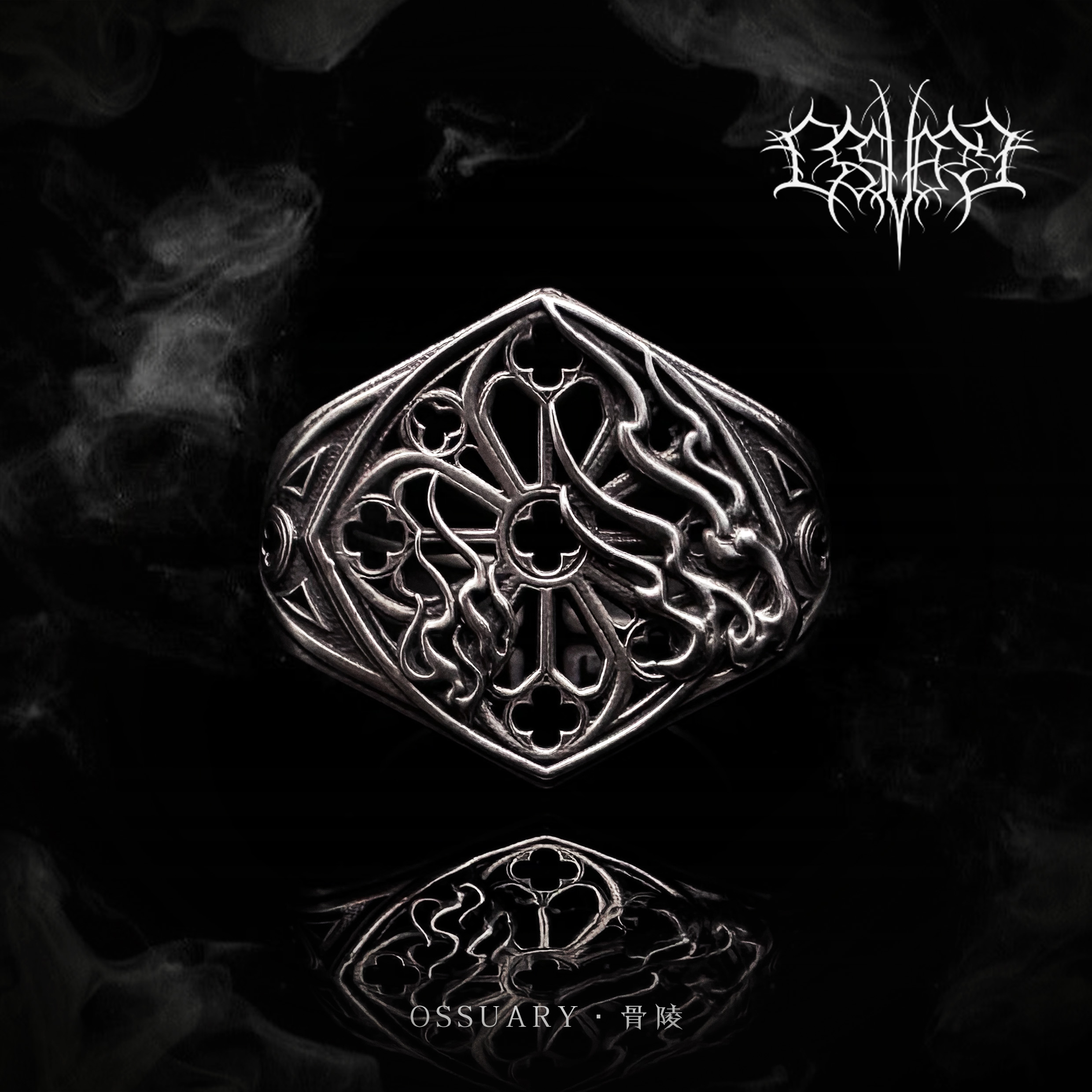 Ossuary "VARG" burning cathedral Gothic relief stained window sterling silver dark ring original design of the bone tomb