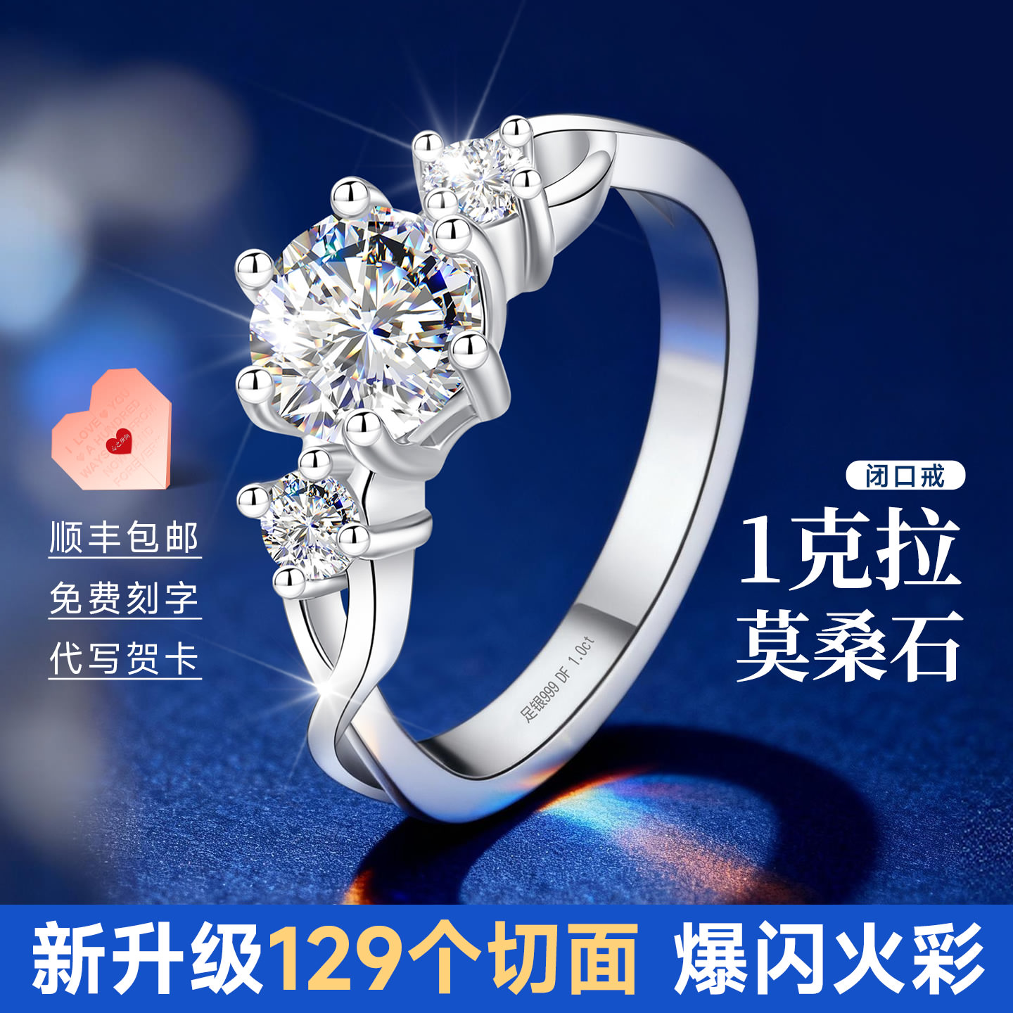 Silver ring women's single 999 sterling silver closed couple ring women's 1 carat moissanite diamond moissanite diamond ring