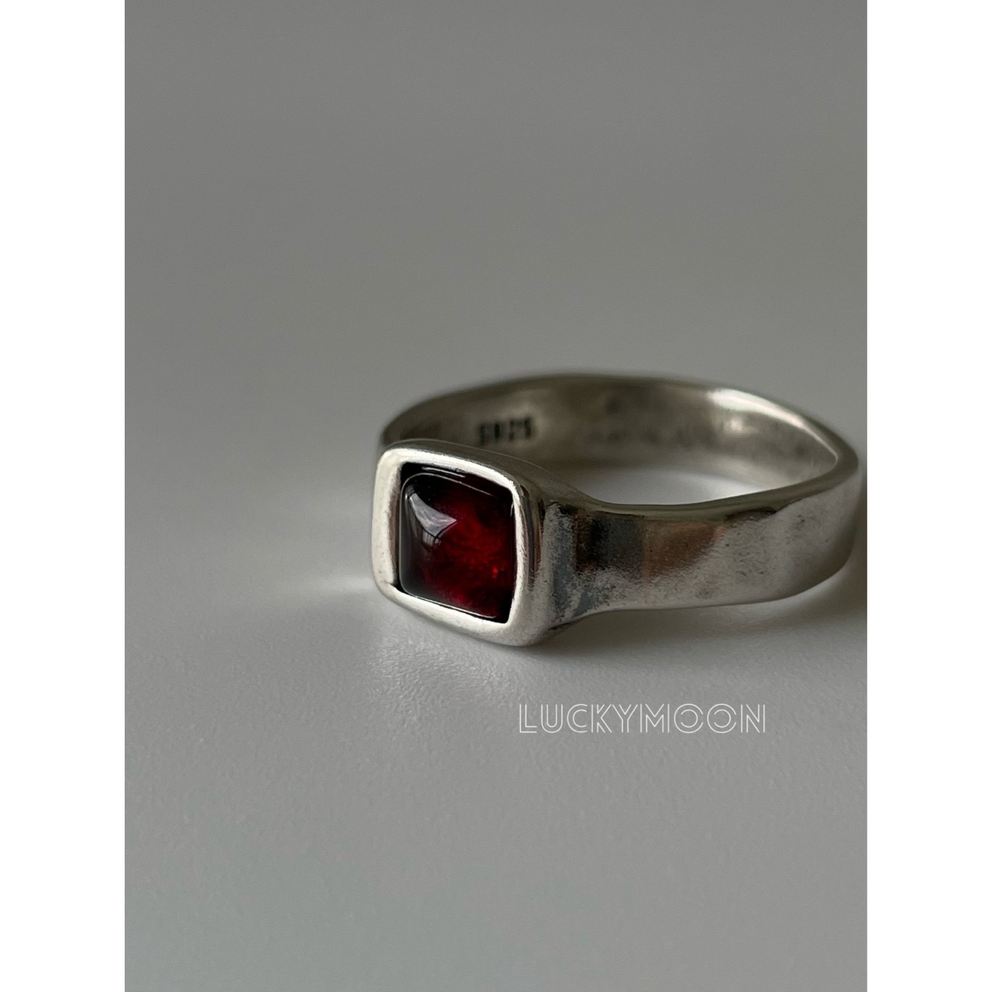 LUCKYMOON vintage distressed hip-hop handmade red glass inlaid ring S925 full-body sterling silver R296