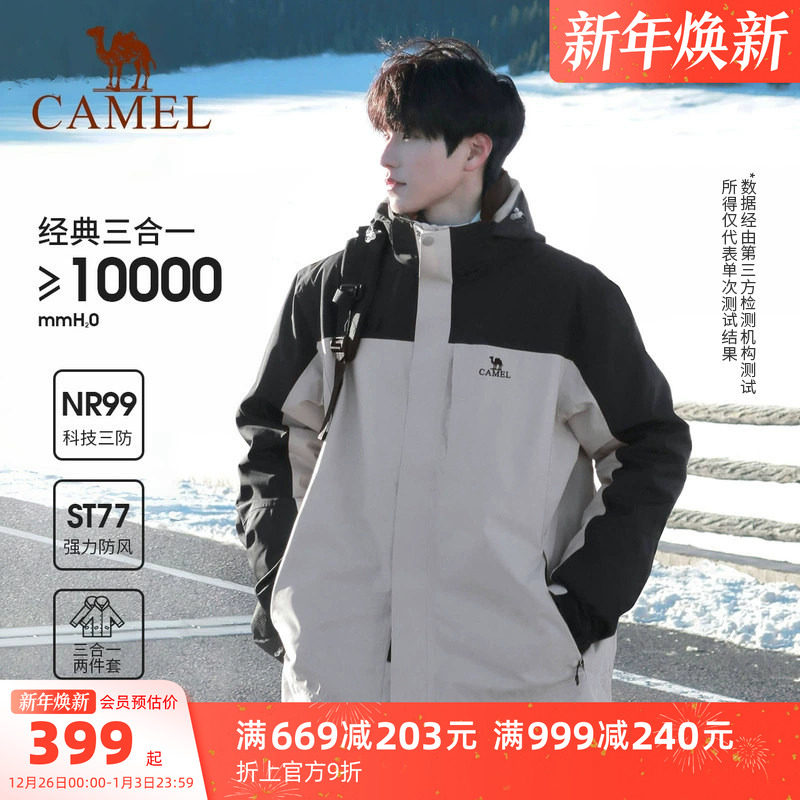 Camel outdoor rain god jacket, men's three-in-one down jacket, winter waterproof jacket, women's three-proof tourist ski suit
