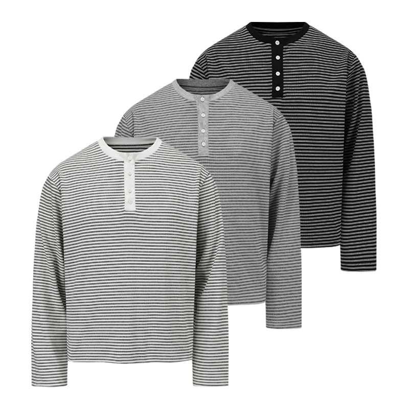 MANUSCRIPT striped henry neck long sleeve T-shirt front shoulder black and white men's casual basic retro base shirt