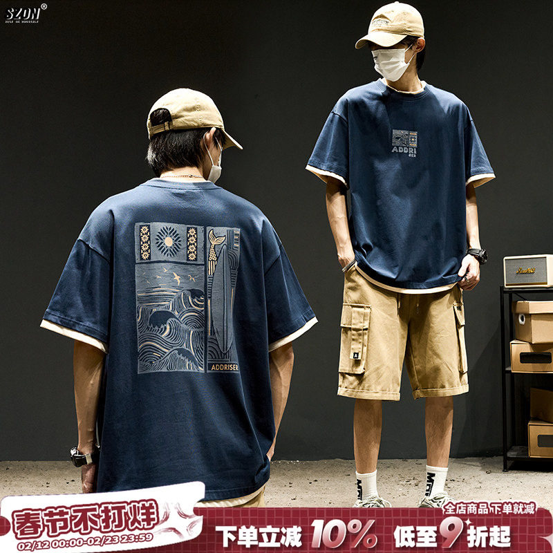 Short sleeve T-shirt men's summer American retro fun print half sleeve Japanese trendy brand heavy cotton fake two-piece top