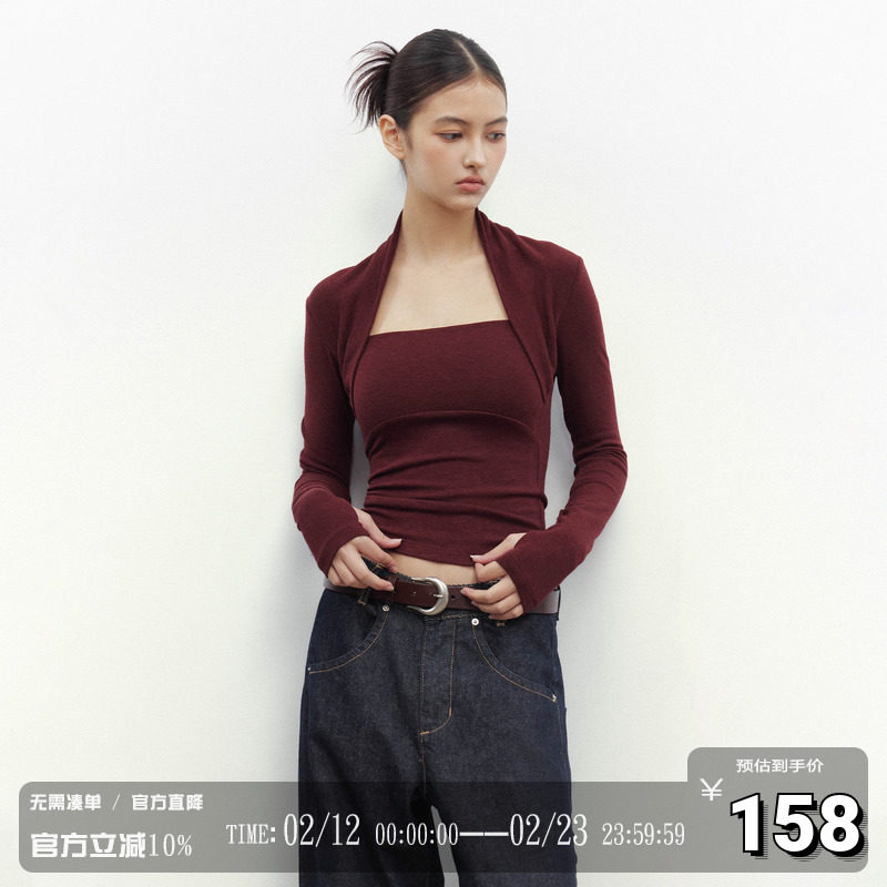 CODICE LAB bamboo pattern shoulder long sleeve fake two slim slimming versatile textured base tops