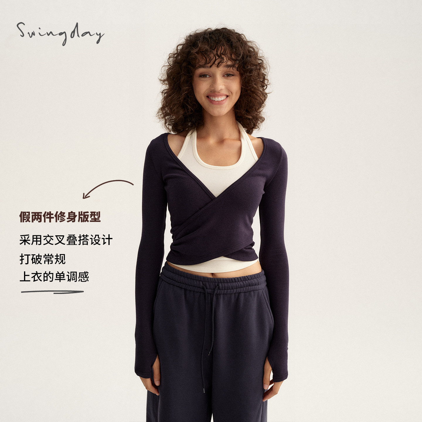 Winter thickened silver fox velvet gray front shoulder V-neck long sleeve T-shirt women's warm inner base layer hot girl waist top