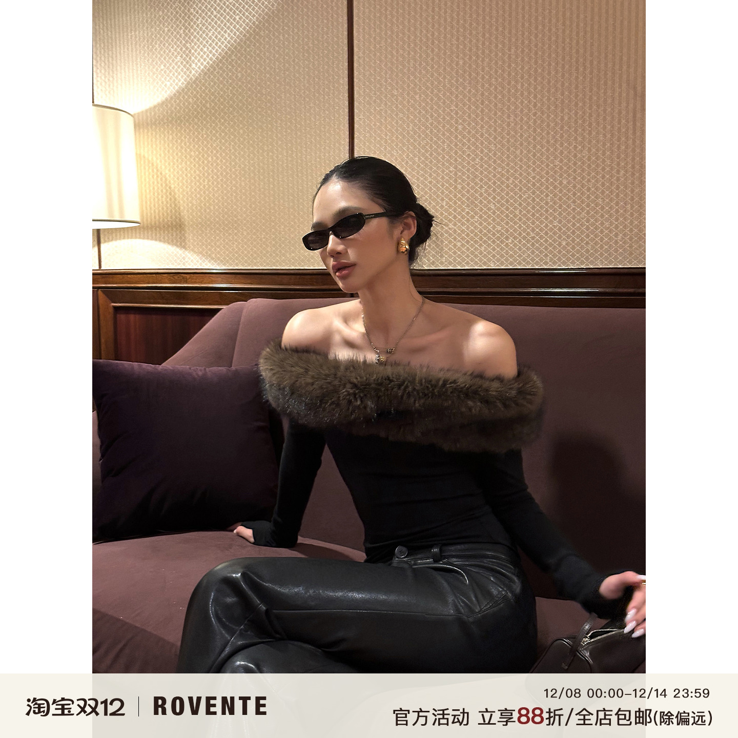 rovente fragrant shoulder rebellion, black fur collar, one-shoulder T-shirt, long sleeves, slim off-the-shoulder, bandeau hottie top