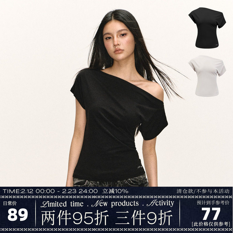 Ariseism American vintage design slanted shoulder short sleeve T-shirt women's summer new off-the-shoulder waist slim top