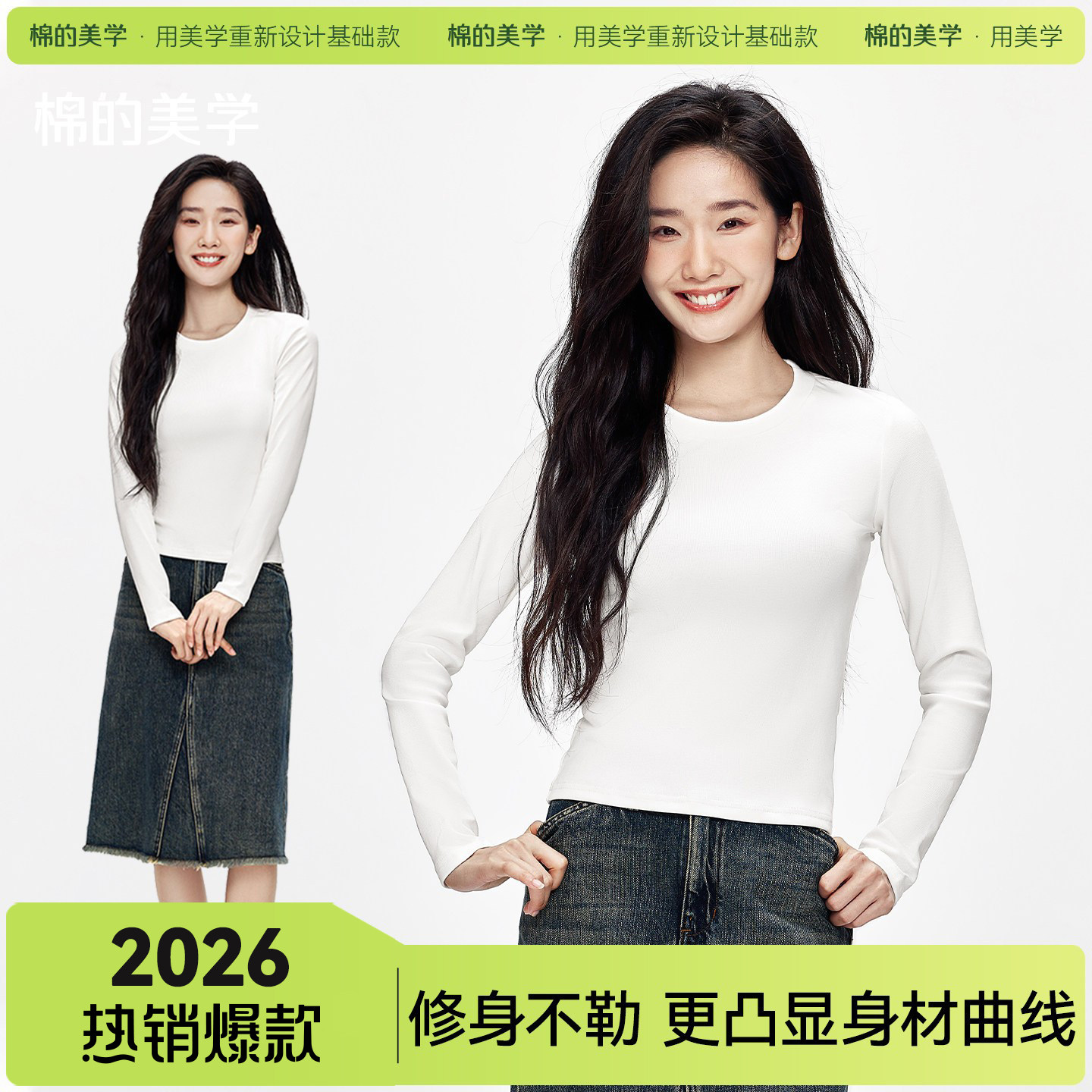 "Cotton Aesthetics" white inner base shirt, women's crew neck sweatshirt, full-shoulder long-sleeved T-shirt, autumn slim top