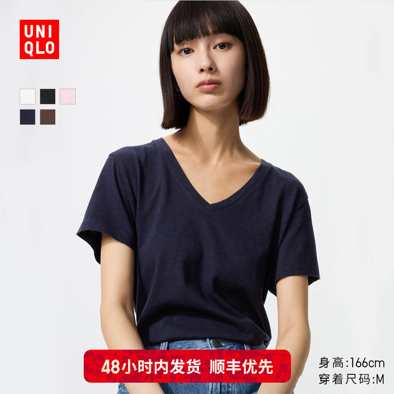 Priority is given to SF Uniqlo women's slub gauze V-neck T-shirt/short-sleeved cotton white T-shirt with a 483576 underneath