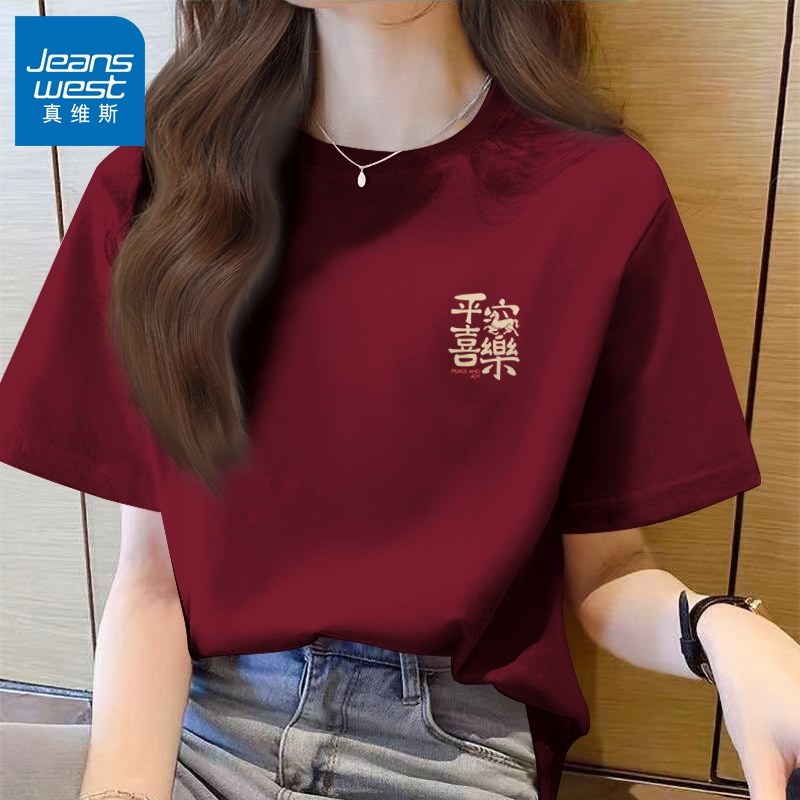 Zhenwei burgundy natal year short-sleeved T-shirt women's summer 2026 new cotton New Year of the Horse New Year loose top X
