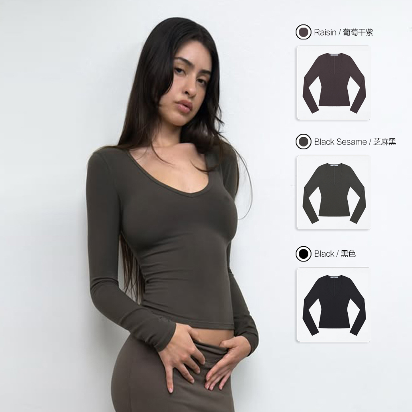 Tankair Grape Purple New V-Neck Slim Long Sleeve Cotton Elastic Series Solid Color Waist Cut Base Layer