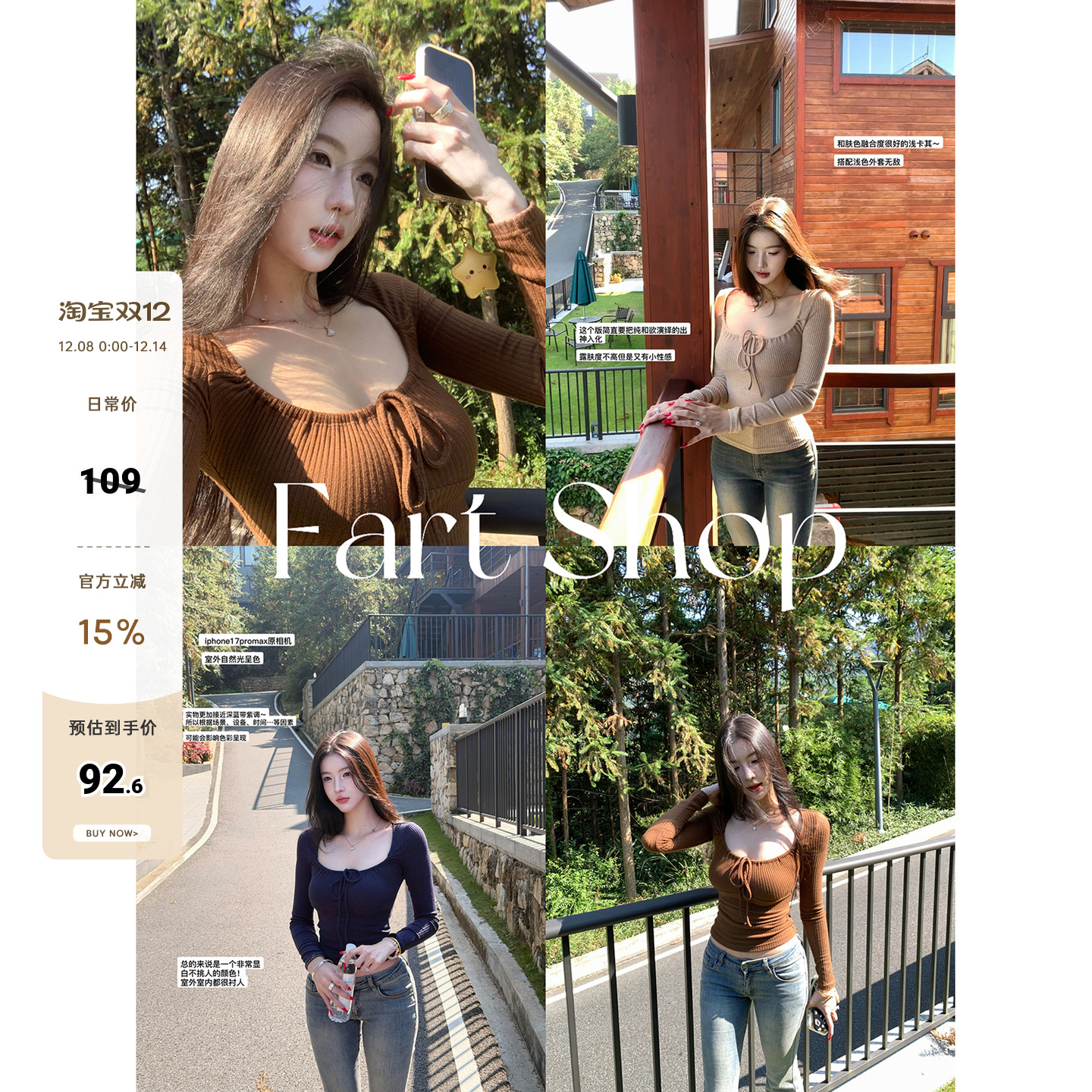【Fart Shop】Pure and desire three-color strap long sleeve women's autumn pit strip square neck white base shirt top