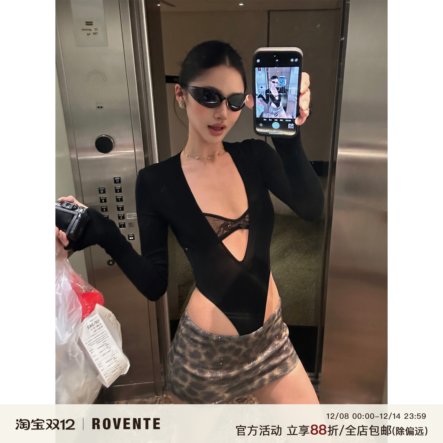 rovente indulgent urban black long sleeve jumpsuit feminine hottie lace V-neck T-shirt top