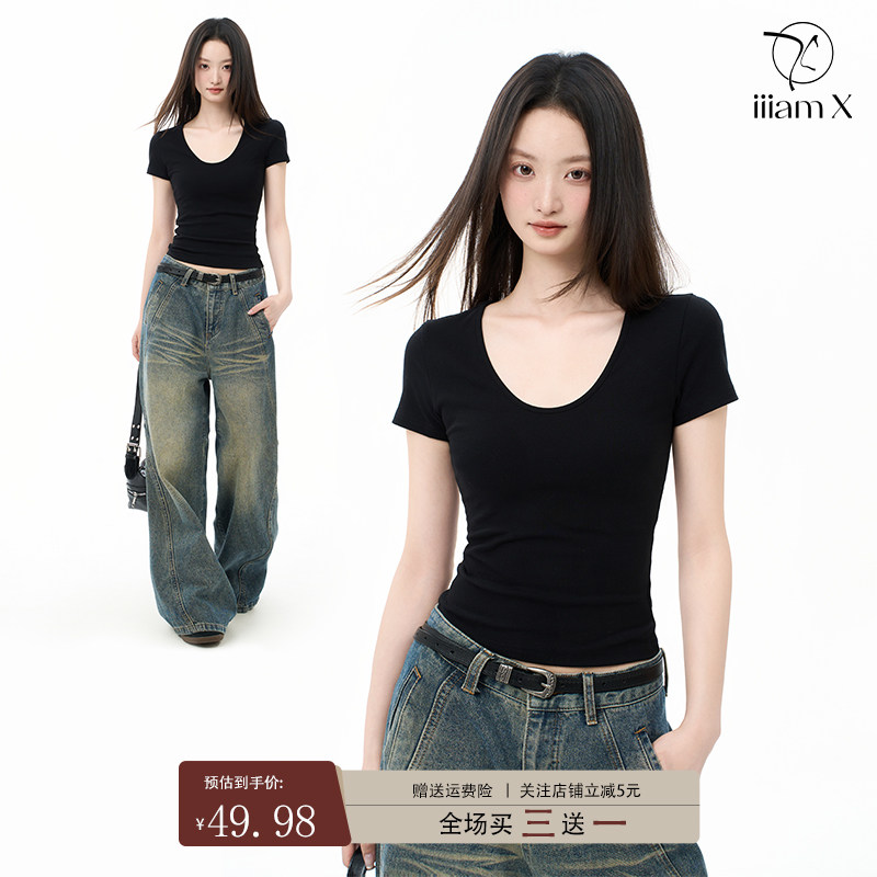 iiiamx black U-neck large neckline short-sleeved T-shirt women's summer slim front shoulder slimming base top 2025 new model