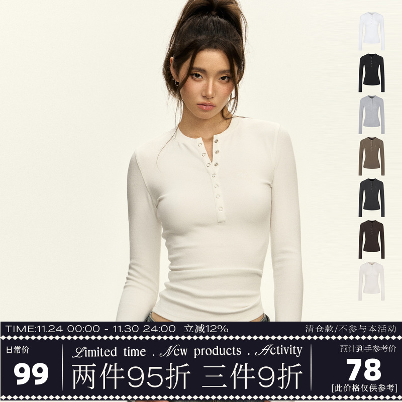 Ariseism American Henry Neck White Slim Long Sleeve T-Shirt Women's Fall Tight Top with an Undershirt