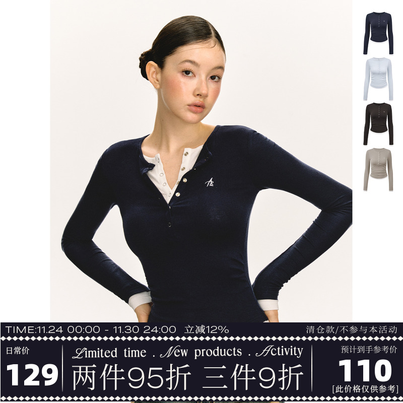 Ariseism American Henry Neck Slim Knit Fake Two Long Sleeve T-Shirt Women's Fall Underwear Top Base Layer