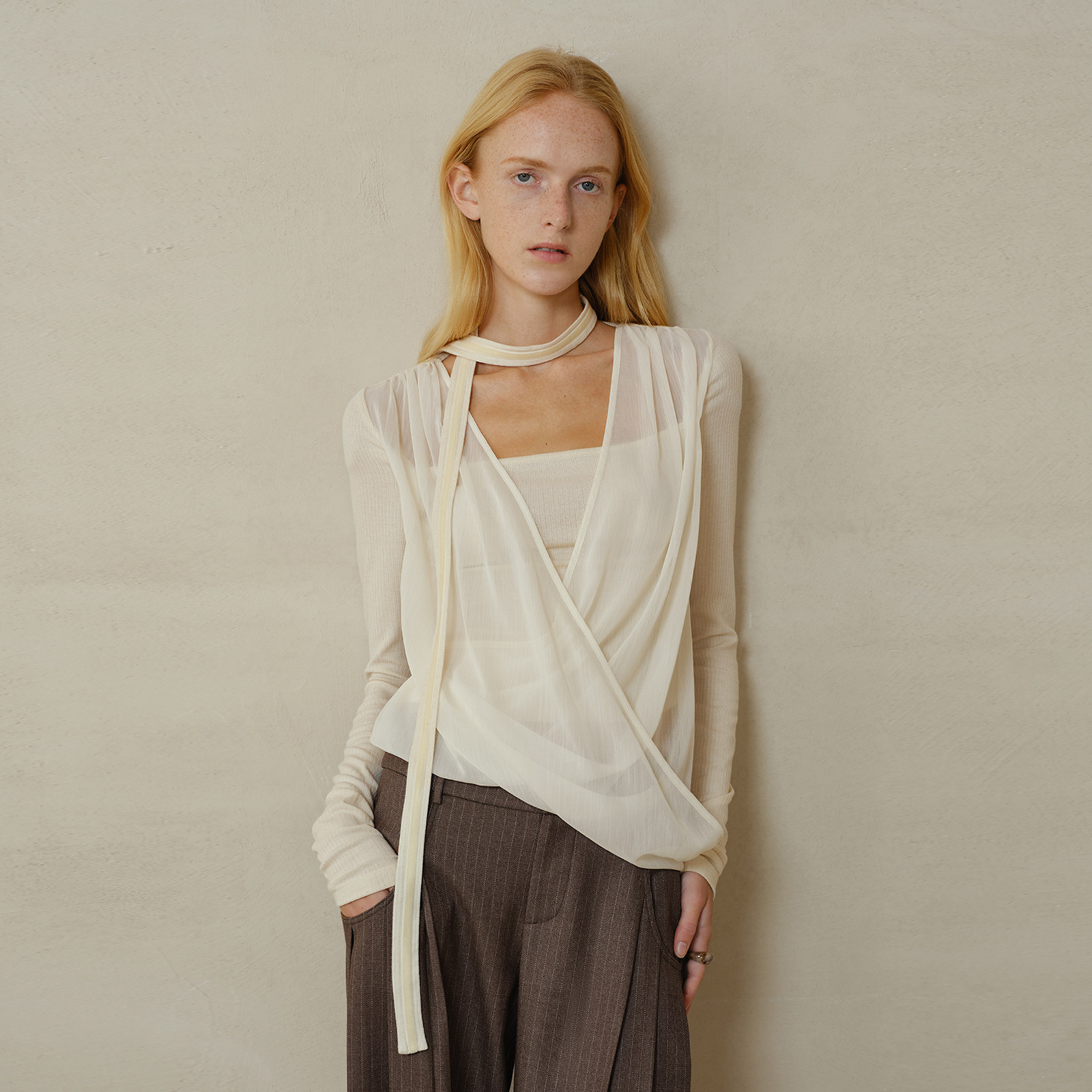 Someone Sometimes original draped overlapping mesh fake two velvet halterneck wool knit tops