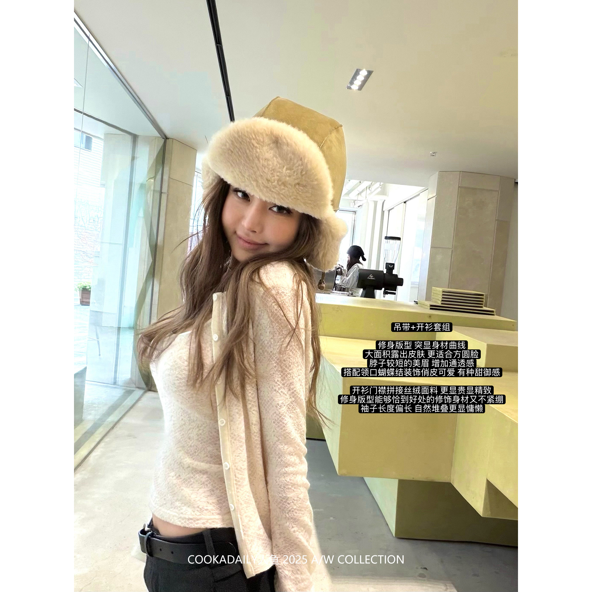 cookadaily mermaid Korean sweet lace patched velvet bow suspender long sleeve cardigan set two-piece