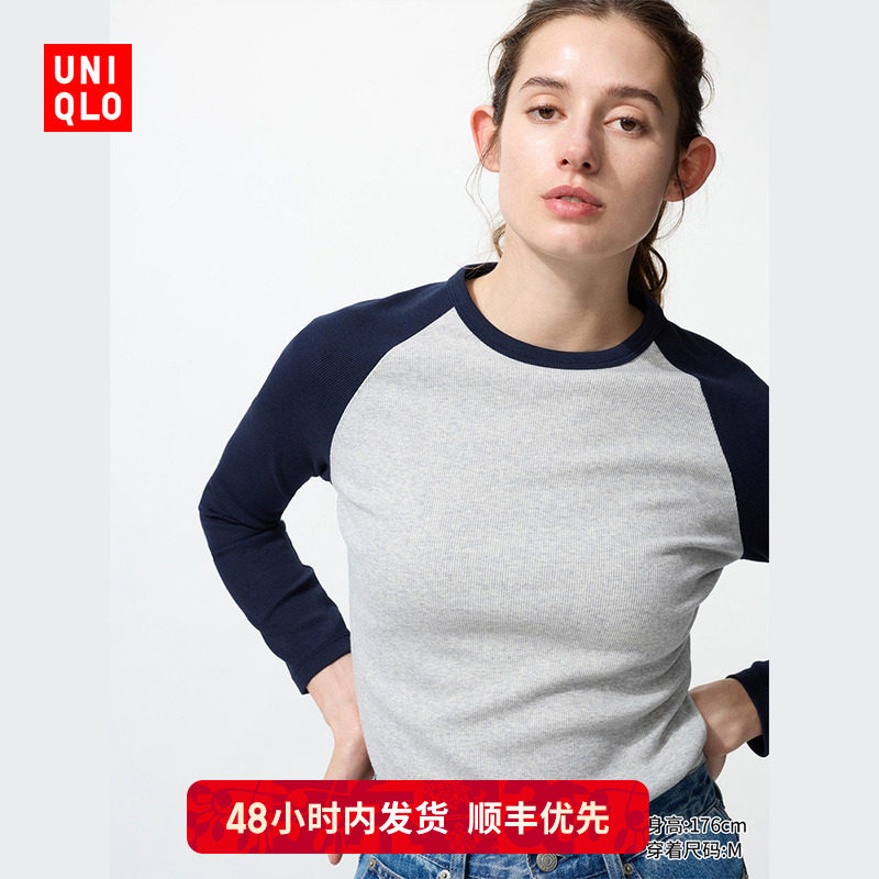 Priority: SF Uniqlo Women's Soft Ribbed Contrast Crew Neck T-Shirt/Long Sleeve Ralan Sleeves with 481438 Inside