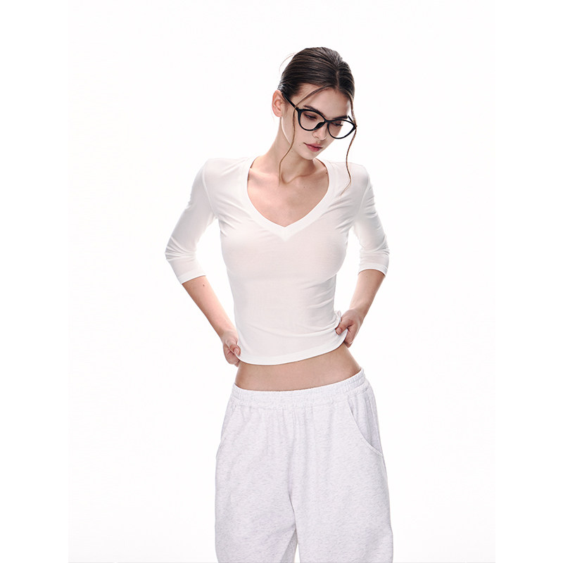 JLAUNT White Short Sleeve T-Shirt Women's Spring Design Slim Bottom Shirt V-neck Long Sleeve Shirt Hot Girl Top