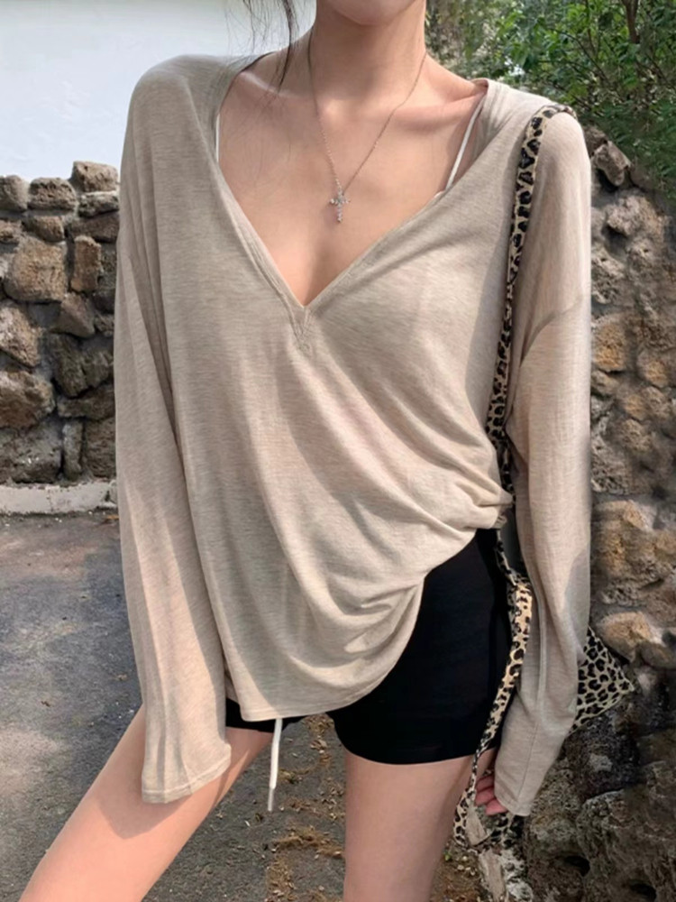 Relaxed and lazy style, V-neck, loose pullover, long-sleeved sunscreen T-shirt, women's summer pure desire, thin cover-up, air conditioning shirt top