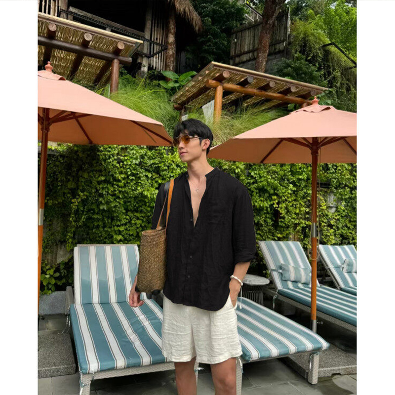 Old money style imitation linen black stand-up collar shirt men's summer relaxation vacation wear sunscreen shirt thin jacket