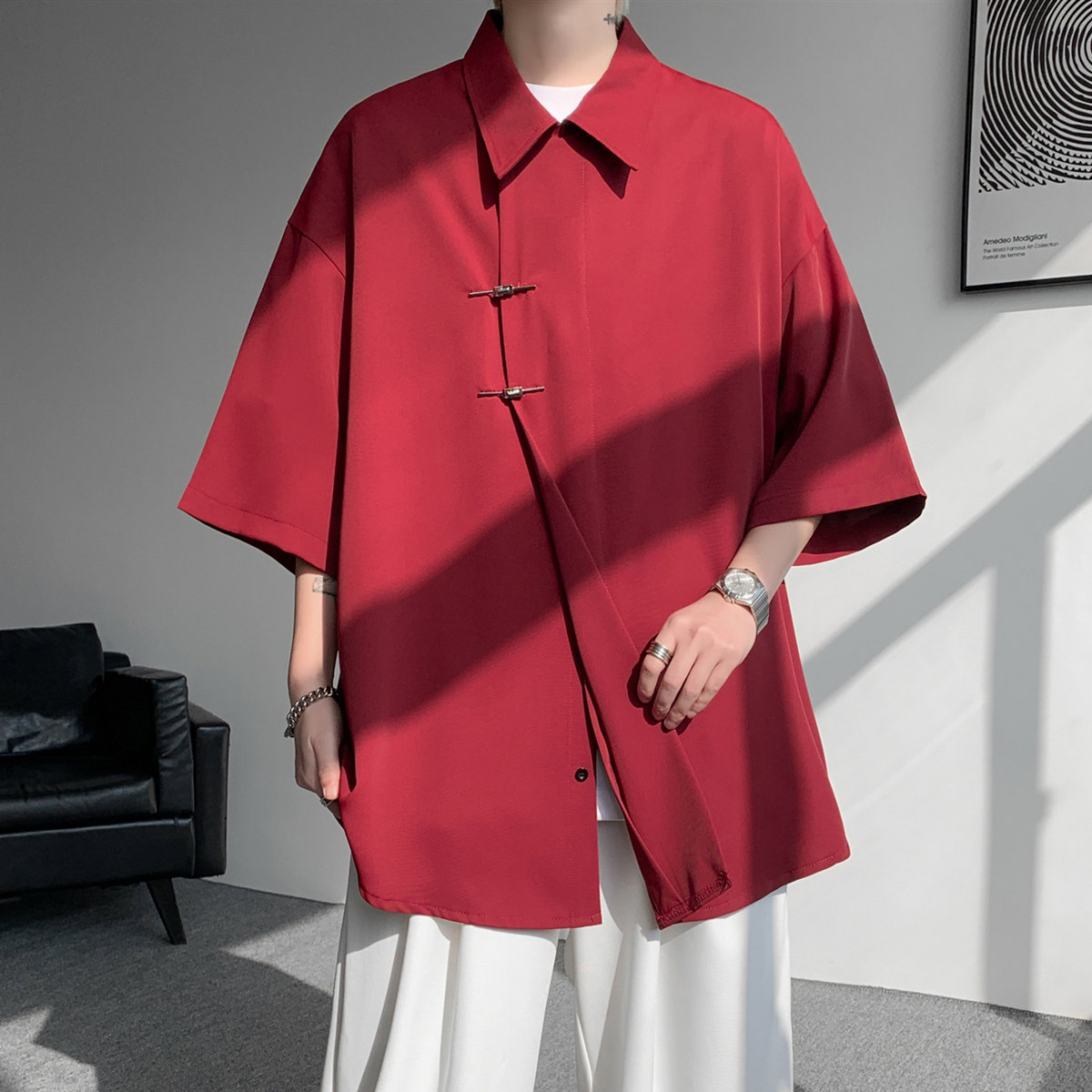 Ice silk drape short-sleeved shirt men's summer fat plus size trendy fat man loose three-quarter sleeve shirt national style airplane buckle